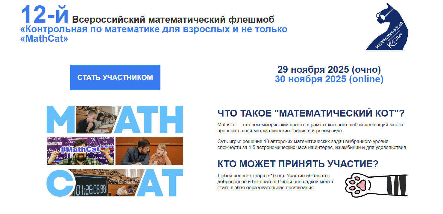 ФГАОУ ВО «Пермский государственный национальный исследовательский университет» (далее – ПГНИУ) 29 ноября 2025 г. проводит 12-й Всероссийский математический флешмоб «Контрольная по математике для взрослых и не только «MathCat» на базе Физико-математического института ПГНИУ. Регистрация участников по ссылке:https://mathcat.info/lk/register Просим довести информацию до сведения руководителей подведомственных вам общеобразовательных организаций и обеспечить активное участие обучающихся в мероприятии. | |