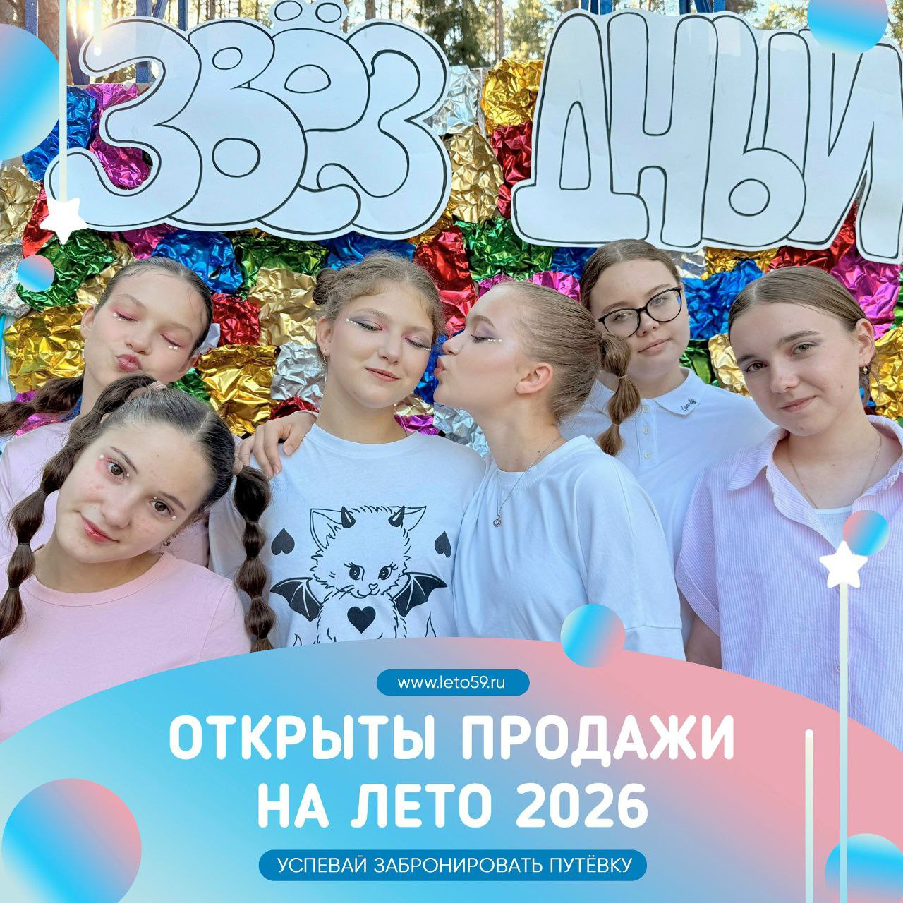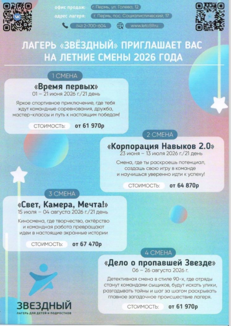 1. ЗДОЛ «Звездный» (5 км от п.Гайва, г.Пермь) с 01.06 по 21.06, но мест осталось совсем немного. Заявки принимаются только до 16 ч. 23.05.2025