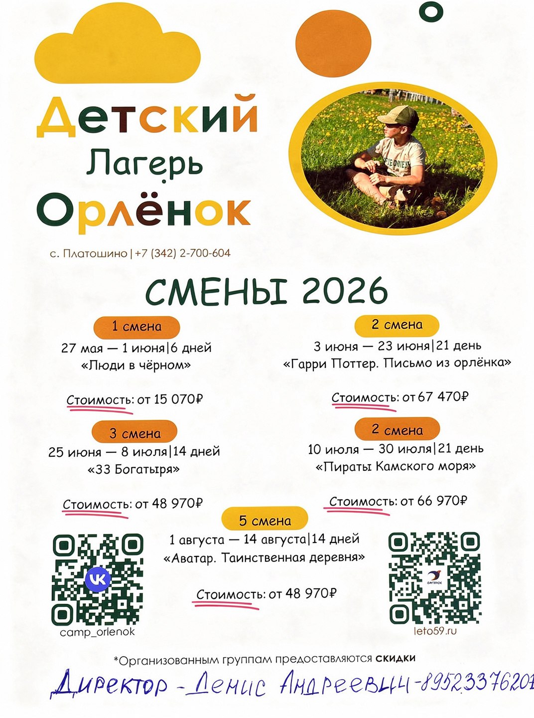 2. ЗДОЛ «Теремок» (п.Верхнечусовские городки, г.Чусовой) 1 смена с 24.06 по 14.07, но мест осталось совсем немного. 2 смена с 17.07 по 06.08.2025