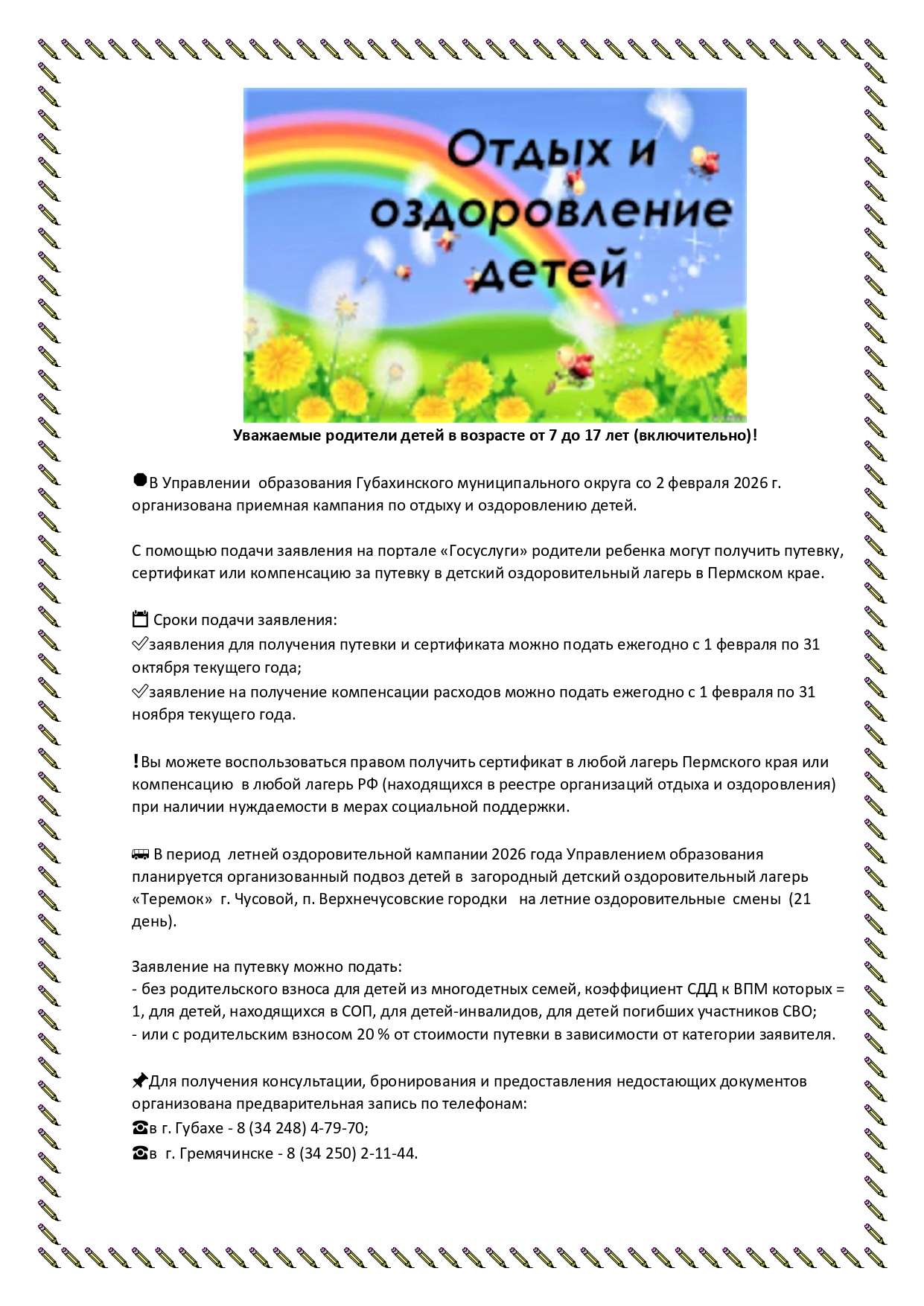 НАПОМИНАЕМ, что в Управлении образования Губахинского муниципального округа продолжается прием заявлений на путевки в: